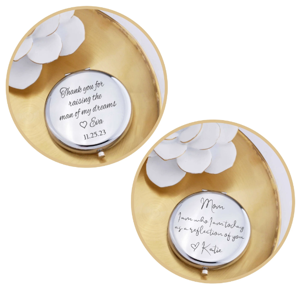 The "Reflection of you" compact mirror is our top-rated gift for Mother of the Bride, and the "Thank you for raising the man of my dreams" mirror is a top gift choice for Mother of the Groom. Save time by ordering the set!