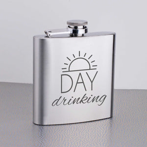 This 6oz stainless steel flask is engraved with a sunrise (sunset?) and "DAY drinking." A funny gift for yourself or a friend to enjoy. Makes a great Christmas or birthday gift for any fun-lover!