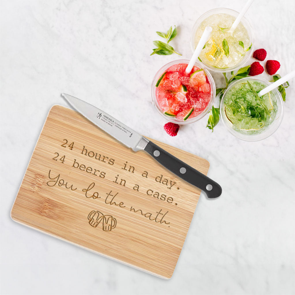 Math anyone can understand!  This compact bamboo cutting board is engraved with "24 hours in a day.  24 beers in a case.  You do the math".
